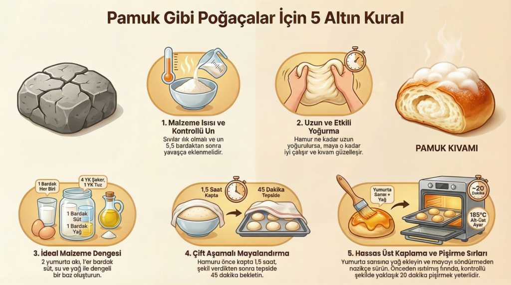 Yumuşak bir poğaça istiyorsanız, daha hamuru yoğurmaya başlamadan dikkat etmeniz gereken ilk kural “ısı dengesi”dir. Soğuk süt veya soğuk su, mayanızı şoka sokar ve uyanmasını engeller. Aktifleşmeyen maya ise sert bir poğaça demektir.